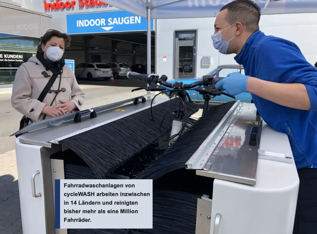 Maschinelle Fahrradwäsche – Zuschauen statt schrubben Die gründliche Reinigung und Pflege von Fahrrädern ist aufwändig und zeitraubend. Zudem sind neben Reinigungs-und Pflegechemieutensilien Ständer, Halterung und ausreichend Putzfläche notwendig. Mitte April 2021 testete das CleanCar Hochleistungs-Autowaschcenter in Neuss eine halbautomatische Fahrradwaschanlage des Kölner Unternehmens cycle- WASH, Markführer für Fahrradwaschanlagen.